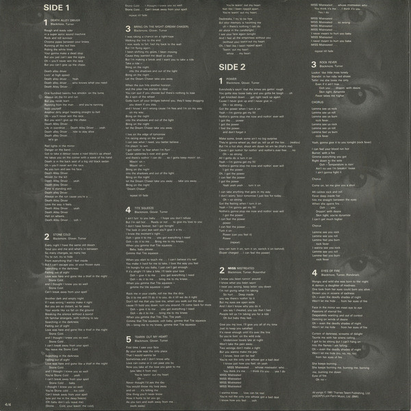 - Written-By – Bobby Rondinelli (tracks: B4), Rosenthal* (tracks: B2), Turner*, Blackmore*, Glover* (tracks: A2 to B1)