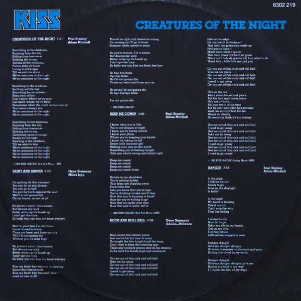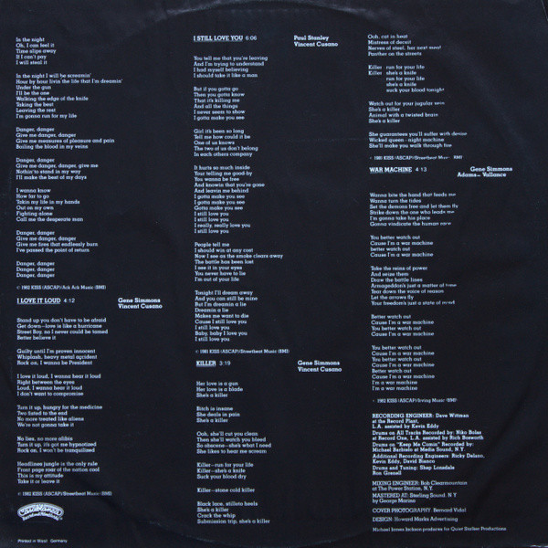 - Written-By – A. Mitchell* (tracks: A1, A3, A5), G. Simmons* (tracks: A2, A4, B1, B3, B4), P. Stanley* (tracks: A1, A3, A5, B2), V. Cusano* (tracks: B1 to B3)