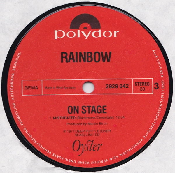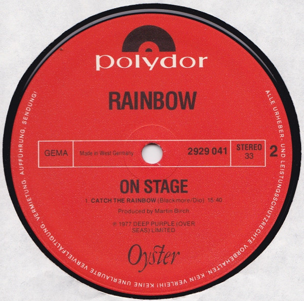 Some copies have a golden sticker "Live! Specially priced two-record set featuring Ritchie Blackmore Ronnie James Dio Cozy Powell".
