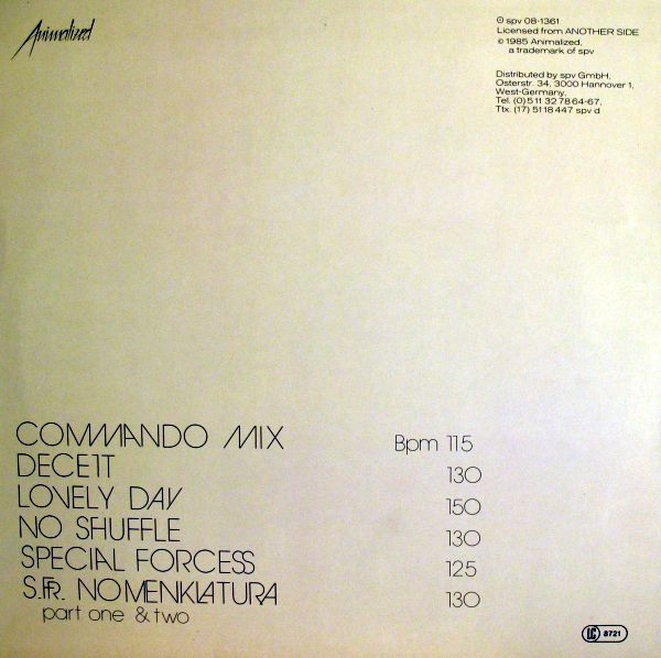 On back cover, track A2 is titled as "S.FR. Nomenklatura part one & two" and track B3 is misspelled as "Special Forcess".
