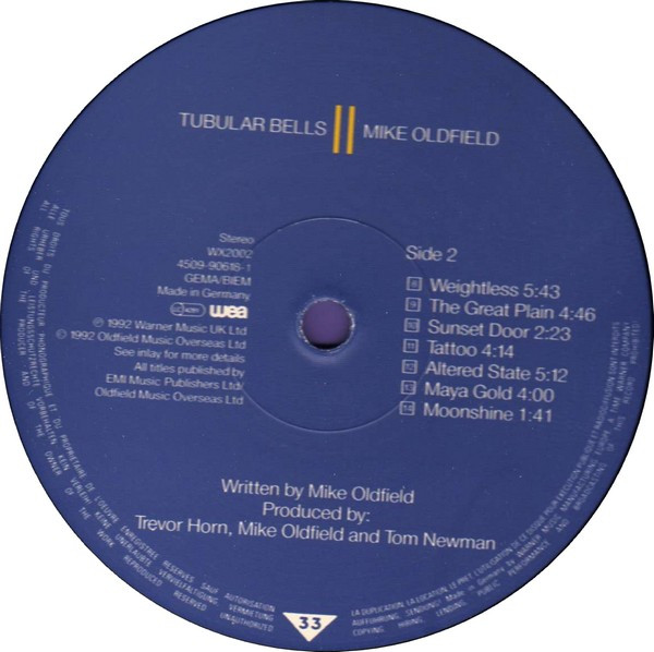 ℗ 1992 Warner Music UK Ltd © 1992 Oldfield Music Overseas Ltd. The copyright in this sound recording is owned by Warner Music UK Ltd and in the artwork by Oldfield Music Overseas Ltd. under exclusive licence to Warner Music UK Ltd. Manufactured In Germany by Warner Music Manufacturing Europe.