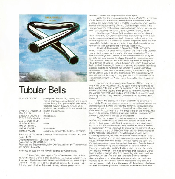 - Grand Piano, Electric Organ [Hammond, Lowrey, Farfisa], Acoustic Guitar, Electric Guitar, Classical Guitar [Spanish Guitar], Bass Guitar, Glockenspiel, Percussion, Flageolet, Timpani [Concert], Tubular Bells, Chorus [Moribund], Mandolin, Other [Piltdown Man] – Mike Oldfield (tracks: A, B1)