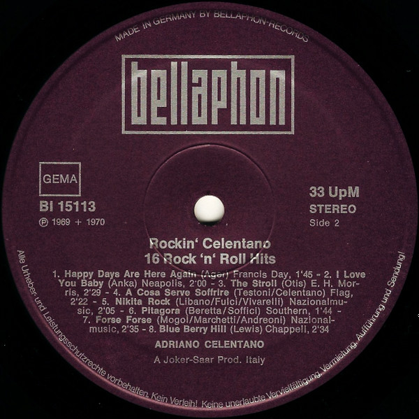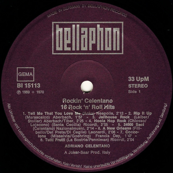 Label has the number on both sides (different from Rockin' Celentano) and says "33 UpM" instead of 33 (other than Rockin' Celentano)