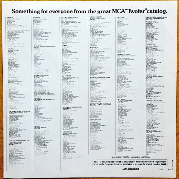 Comes with a four sided booklet with liner notes, track list and two sides a MCA "Twofer" catalog.
