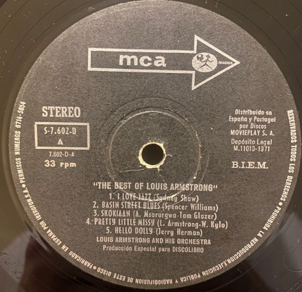 Credited to Louis Armstrong on cover / back cover and Louis Armstrong And His Orchestra on labels.