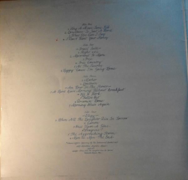 Gatefold jacket and original release had large poster with all band members in soldier's clothing in front of a war cemetery, and a long list of the number of people who had died in American wars.