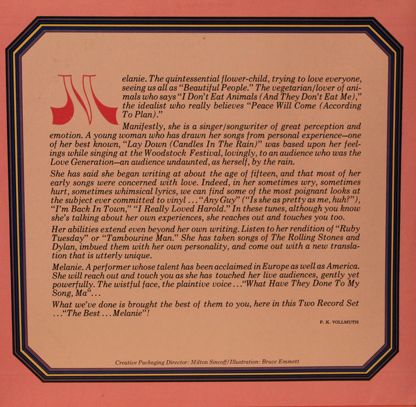Comes in gatefold-cover with words by P.K. Vollmuth and huge photo of Melanie inside.