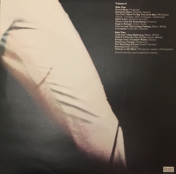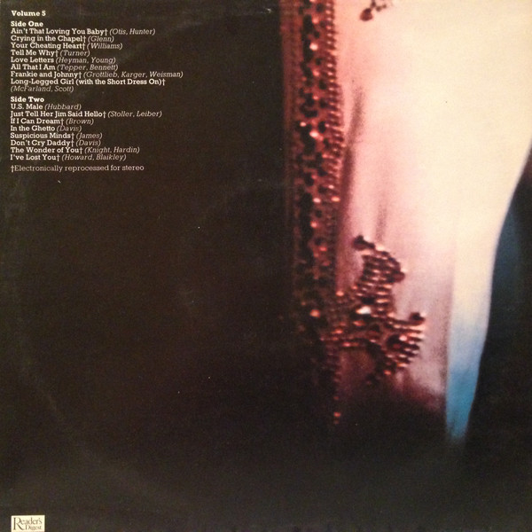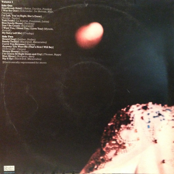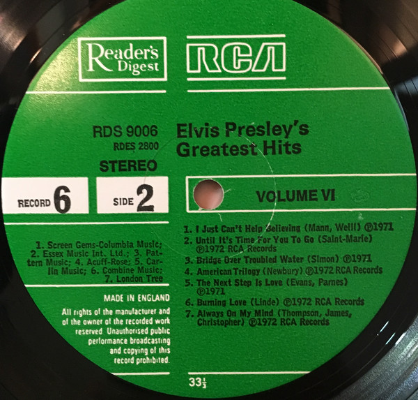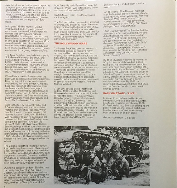 As well as six career compilation LPs, the boxset also included a single LP compilation of songs from his films titled 'Elvis in The Movies'. The sleeve for this LP is the only one with a title printed on the front - the other six are numbered on the front of the sleeve from 1 to 6 with the rear of each showing its track listing and writer credits for each track.