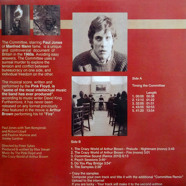 A Film score by Pink Floyd from 1968 which has never been officially released. The film was directed by Peter Sykes, written and produced By Max Steuer, starring Paul Jones. All tracks (except B1 and B2) composed and performed by Pink Floyd and have never been issued before. Important: There are no official track titles on side A. The titles mentioned (as taken from back cover) are, in fact, the timing position of the tracks on the DVD of this movie. B4 through B6 are marked with an asterisk and the note "Copy the samples, compose your own track and title it with the additional "Committee Remix," upload it to the internet - if you are lucky, your track will make it to the second edition."
