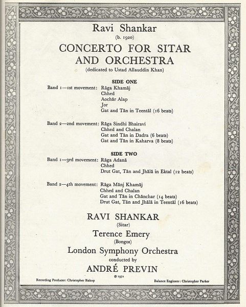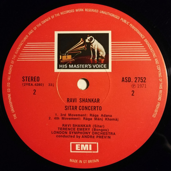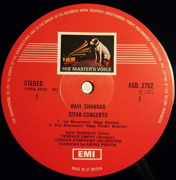 Ravi Shankar, André Previn, The London Symphony Orchestra - Concerto For Sitar & Orchestra has a B/W 'His Master's voice' logo on the labels, and 'Made in Gt Britain' at the bottom of the label. At the back of the inlay (bottom left) it says EMI/R & E/2/72'.