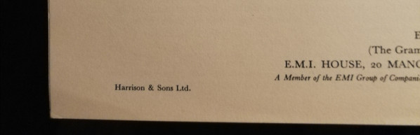 This release has a colored 'His Master's voice' logo on the labels, and 'Made in Gt Britain' at the bottom of the label. At the back of the inlay (bottom left) it says 'Harrison & Sons Ltd.'