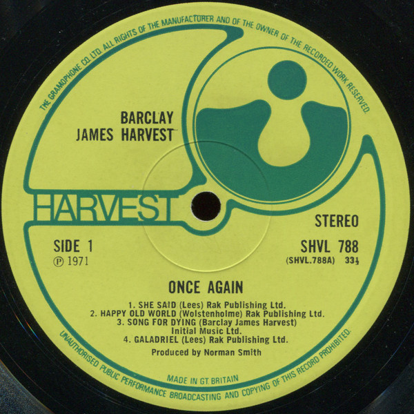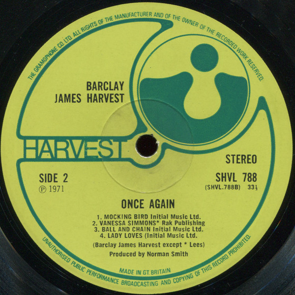The first edition on yellow/green Harvest label without EMI logo on labels.