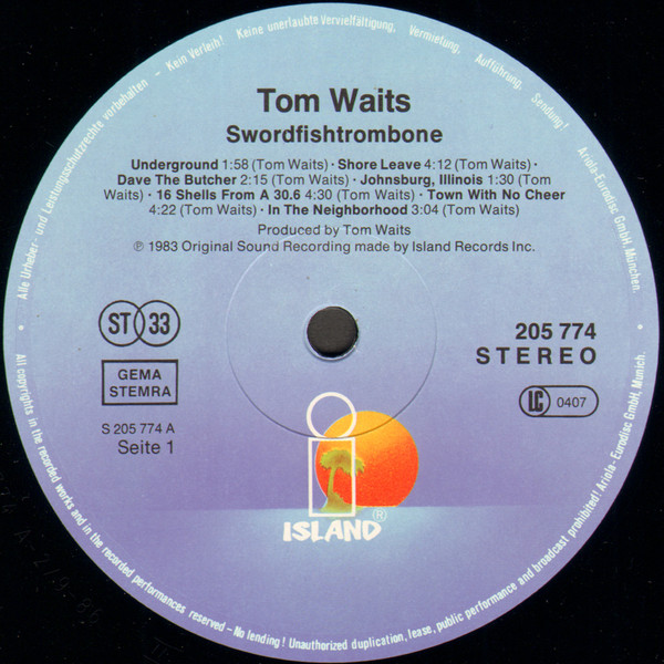 Album title misspelled "Swordfishtrombone" on labels.