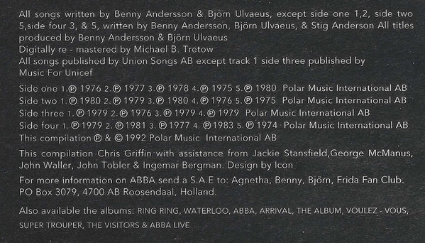 - Written-By – Benny Andersson & Björn Ulvaeus*, Stig Anderson (tracks: A1, A2, B5, D3, D5)