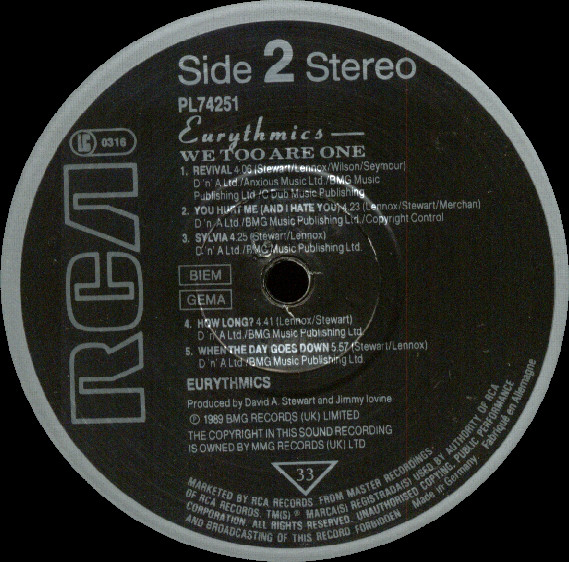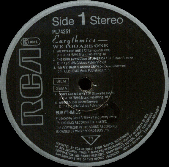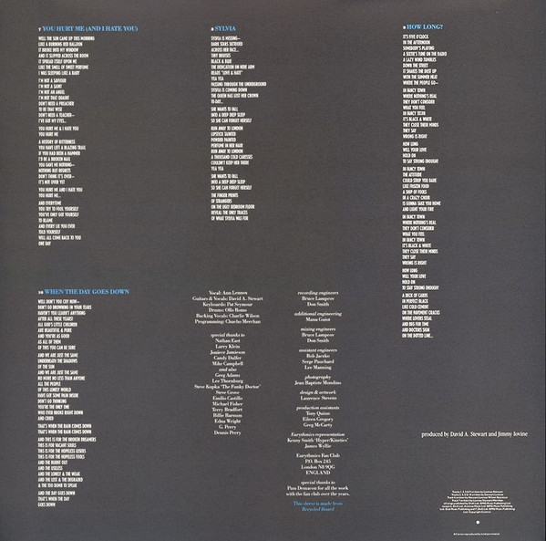 Includes a fold-out insert with lyrics & credits on one side and a part of Annie Lennox's face on the other side.