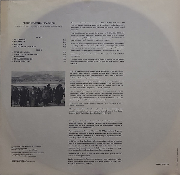 "I have put together two albums around the music of The Last Temptation of Christ. This album is my work; the other, Passion Sources, represents a selection of some of the traditional music, sources of inspiration and location recordings. I was excited to be asked to work on the music. When I first discussed the project with Martin Scorsese in 1983 I wanted to find out how he was intending to film this controversial novel. He wanted to present the struggle between the humanity and the divinity of Christ in a powerful and original way, and I was convinced by his commitment to the spiritual content and message. He is an excellent and very musical director and working with him has been a great experience.