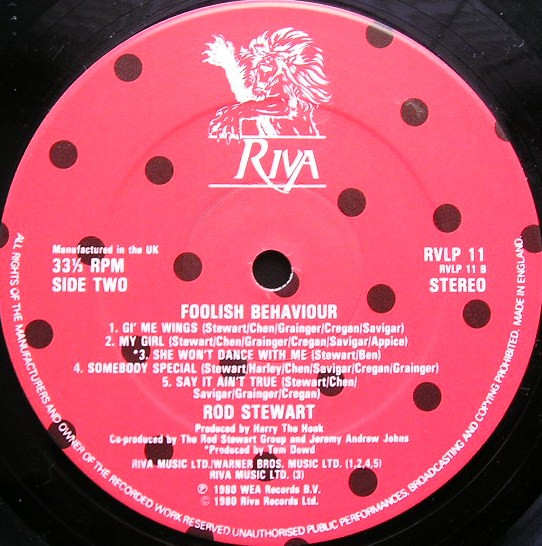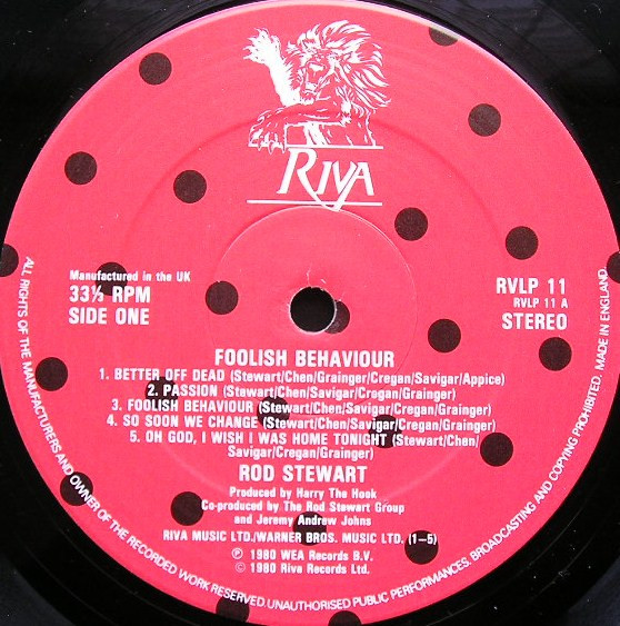 Foolish Behaviour credits WEA Records Pressing Plant, West Drayton and Sterling Sound in runouts.