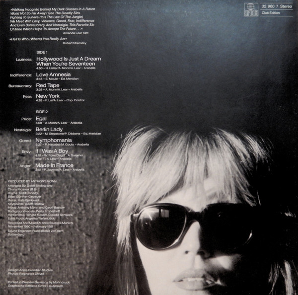 "Walking incognito behind my dark glasses in a future world not so far away I see the deadly sins. Fighting to survive (it is the law of the jungle) we meet with envy, violence, greed, fear, indifference and even bureaucracy and nostalgia, this favorite sin of mine which helps to accept the future ..." - Amanda Lear, 1981.