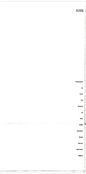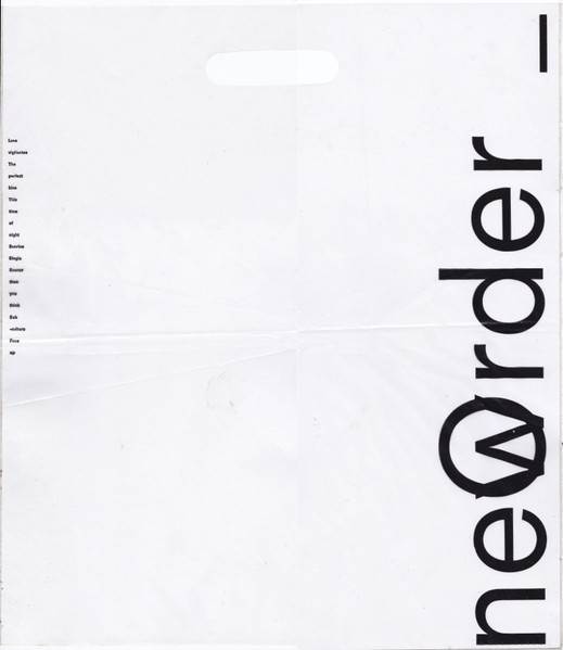 Thin printed inner sleeve. This Swedish first pressing did not come with the UK-style onion paper outer sleeve, however some copies came with a clear plastic 'shopping' or 'carrier' bag measuring approximately 354mm x 403mm. Along one vertical edge is stated "newOrder" - where the 'w' and the 'O' are on top of each other. Along the other vertical side of the bag is the running order of the songs in black lower-case letters. Opposite that is stated, one word per row: "Photographed by Trevor Key Designed by Peter Saville Associates. Factory Records, Manchester, England"