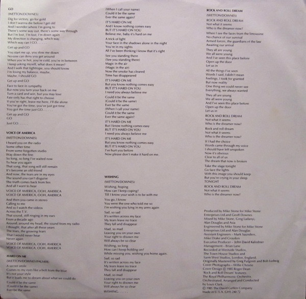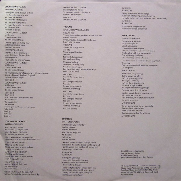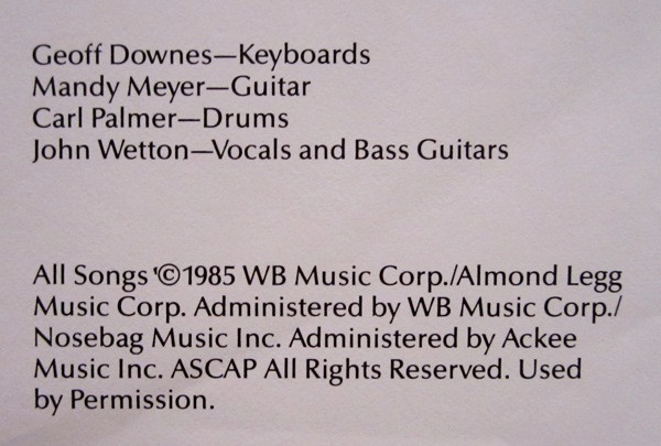 - Written-By – Palmer* (tracks: A3, B3), Downes*, Wetton*