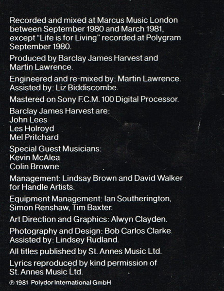 Recorded and mixed at Marcus Music London between September 1980 und March 1981, except "Life is for Living" recorded at Polygram September 1980.