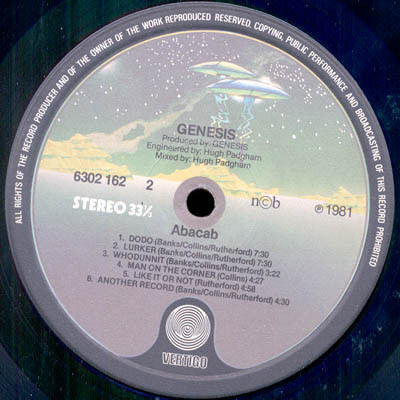 Other Scandinavian release found here: Abacab has longer rim text. Second half of rim text reads: "Unauthorised copying, hiring, lending, public performance and broadcasting of this record prohibited".