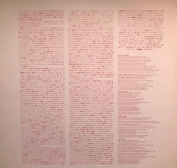 Matte cover with obi having one thicker black section with white and black text and a thinner white section with red text. Also there is a 2-page insert with Japanese and English tracklistings on one side and Japanese language liner notes and English lyrics to songs on the other.