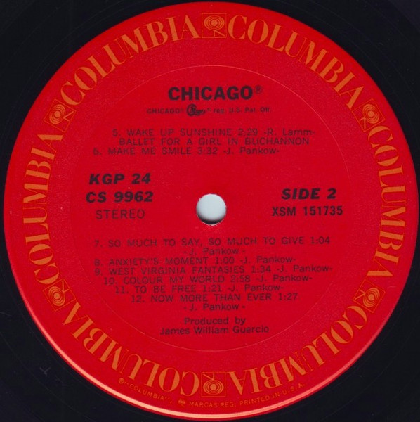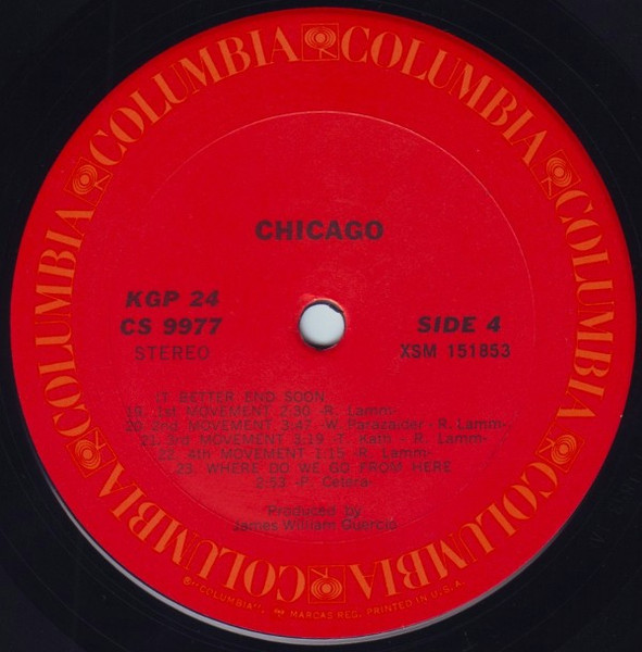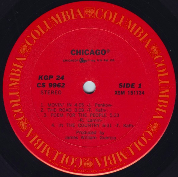 This release, Gatefold with PG 24 on spine & cover, labels with KGP 24 and Chicago® trademarked logo on label sides 1 & 2. Red labels with circular gold Columbia logo. LP's housed in company catalog sleeves and includes a large foldout poster.