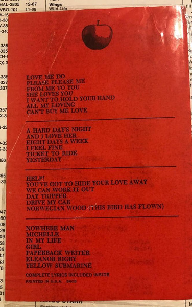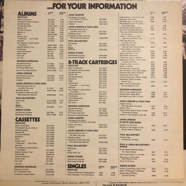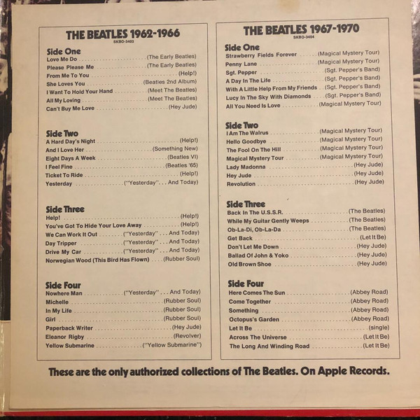 Came with white insert track sheet for both 62-66 and 67-70 albums with "for your information" discography of US Beatles and solo released up to spring 1973.