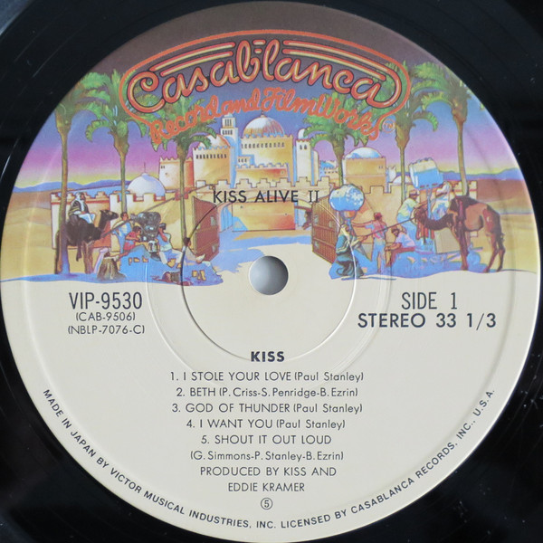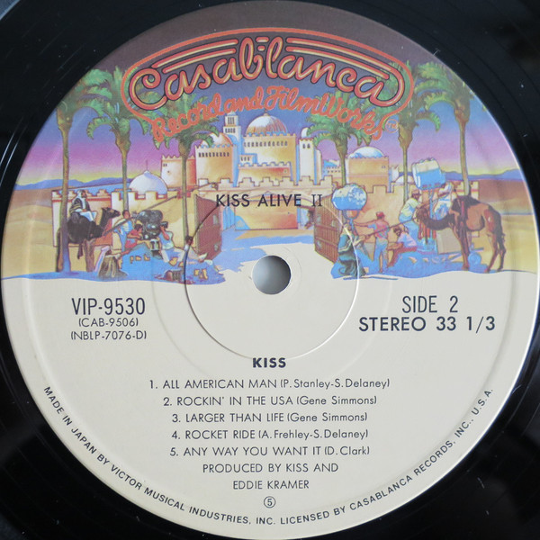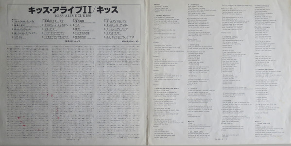Printed inner sleeves, with advertisements for the other 7 Kiss releases in Japan on one side and concert shots with 2 Kiss Army Logos in the bottom corners on the other side.