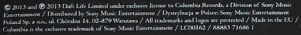 © 2013 and ℗ 2013 Daft Life Limited under exclusive license to Columbia Records, a Division of Sony Music Entertainment / Distributed by Sony Music Entertainment / Dystrybucja w Polsce: Sony Music Entertainment Poland Sp. z o.o., ul. Chóralna 14, 02-879 Warszawa [...] Made in the EU / Columbia is the exclusive trademark of Sony Music Entertainment