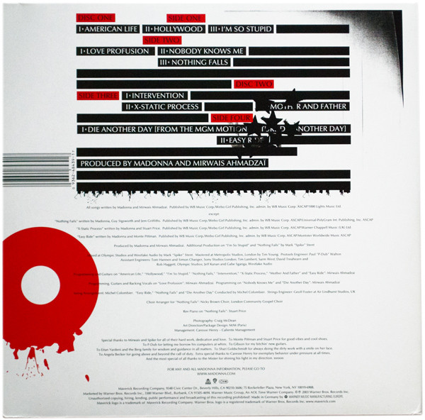 - Written-By – Guy Sigsworth (tracks: B3), Jem Griffiths (tracks: B3), Madonna, Mirwais Ahmadzaï (tracks: A1 to B2, C1, C3, D1), Monte Pittman (tracks: D2), Stuart Price (tracks: C2)
