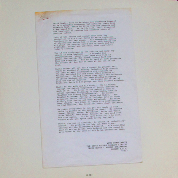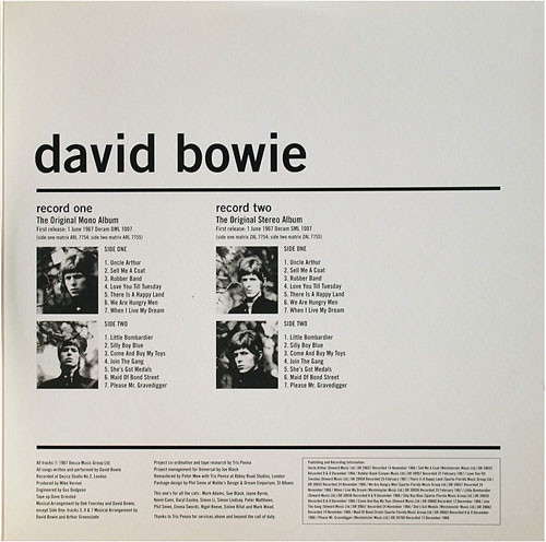 - Arranged By [Musical Arrangements] – Arthur Greenslade (tracks: A3, A4, A7, C3, C4, C7), David Bowie, Dek Fearnley* (tracks: A1, A2, A5, A6, B1 to C2, C5, C6, D1 to D7)