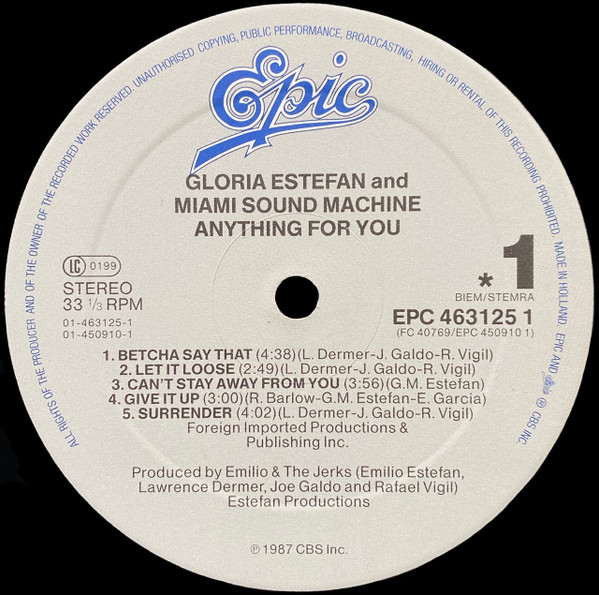 *Exclusive Mix of “Surrender” (track A5) can only be found on this European LP & European Cassette Anything For You (EPC 463125 4 / 01-463125-30). The intro to this version is different from any of the other versions, this versions sounds more like the version that was played live. To date, this version has not appeared on any CD release. You can listen to this Mix, also known as the “LP Mix” on the YouTube Channel (SongsMusiCanto). Pablo Flores is credited on this mix in the credits.