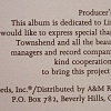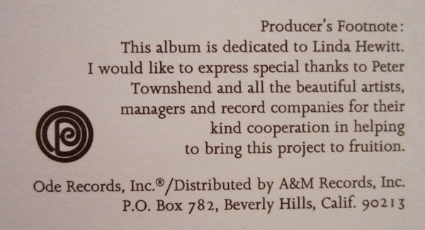 Producer's Footnote: This album is dedicated to Linda Hewitt. I would like to express special thanks to Peter Townshend and all the beautiful artists, managers and record companies for their kind cooperation in helping to bring this project to fruition.