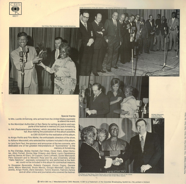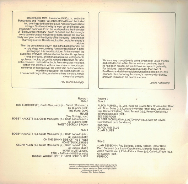 The recordings contained iin this album were made during the festival in memory of Louis Armstrong which was held in the Banqueting and Theater Hall of San Remo Municipal Casino on December 6 and 7, 1971.