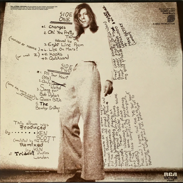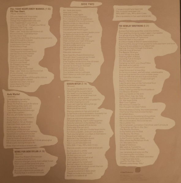 - Written-By – Biff Rose (tracks: B1), Bowie* (tracks: A1 to A6, B2 to B5), Paul Williams (2) (tracks: B1)