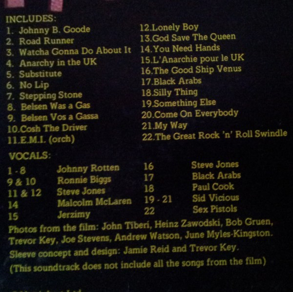 The track listing on the inside gatefold is not in anything like a correct order. It omits 'Rock Around the Clock' altogether, and lists 'Johnny B. Goode' and 'Roadrunner' as two separate tracks. It also mis-titles 'No one is Innocent' as 'Cosh The Driver', 'Friggin' In The Riggin' as 'The Good Ship Venus', and 'C'mon Everybody' as 'Come On Everybody'.
