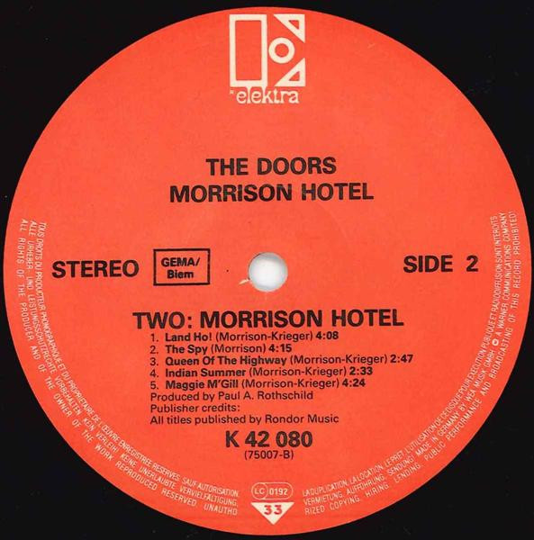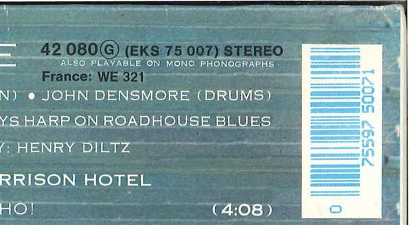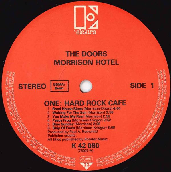 The previous GEMA/Biem edition with white center labels, with round red/black logo and catalog# ELK 42 080, with distribution codes 'France: WE 341' and Ⓩ, no barcode, can be found here: Morrison Hotel