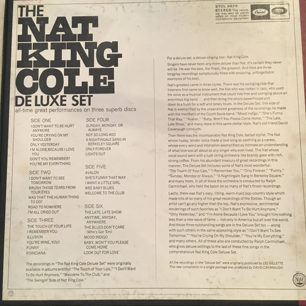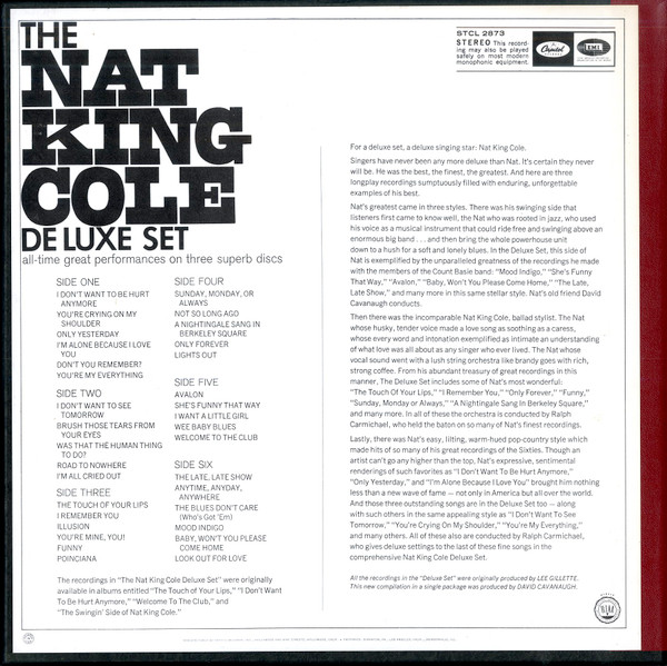 The recordings in "The Nat King Cole Deluxe Set" were originally available in albums entitled "The Touch of Your Lips", "I Don't Want To Be Hurt Anymore", "Welcome To The Club", and "The Swingin' Side of Nat King Cole".