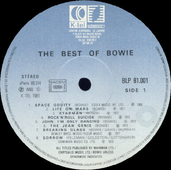 A3, A4, A5: Mainman Ltd./Chrysalis Music Ltd./Bowie (P) 1972