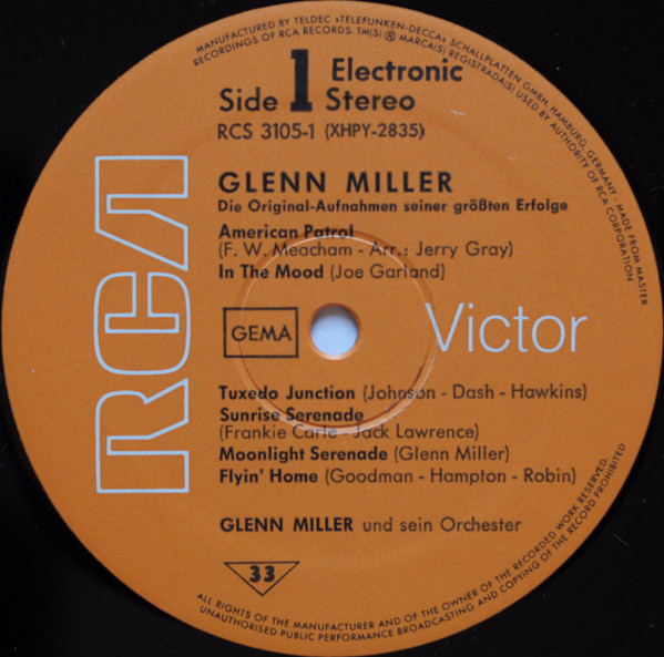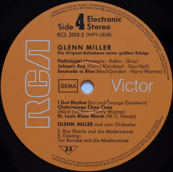 Made in Germany by RCA Schallplatten GmbH, 2 Hamburg 19 from master recordings of RCA