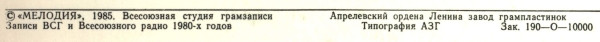 © «МЕЛОДИЯ», 1985. Всесоюзная студия грамзаписи