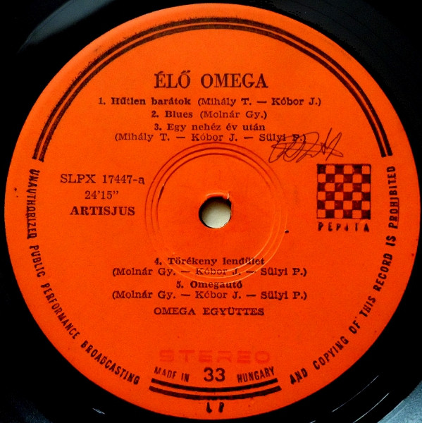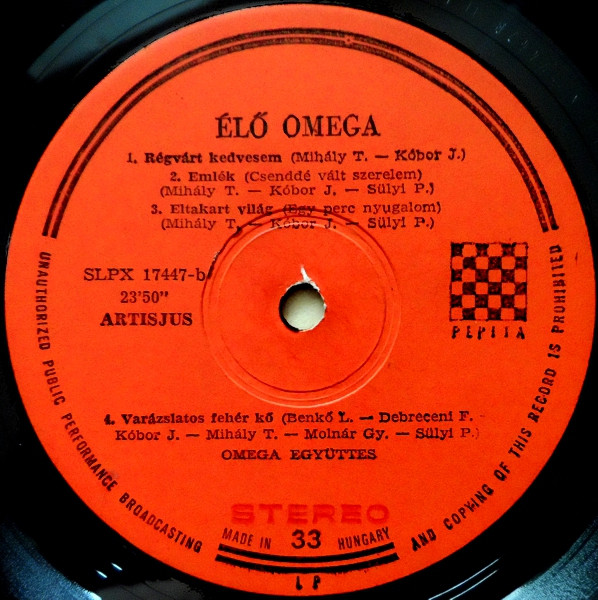 There also exists an edition with a paper sleeve, one with a metal cover with red lettering and English labels: Omega (5) - Élő Omega and one with a metal cover with red lettering and German labels: Omega (5) - Élő Omega