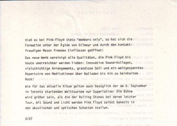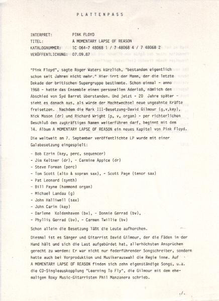 Largely identical to Pink Floyd - A Momentary Lapse Of Reason, except that has BIEM/GEMA rights societies.