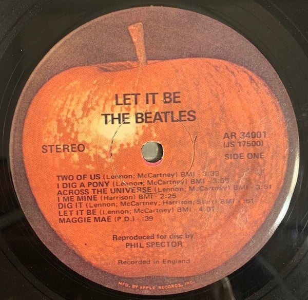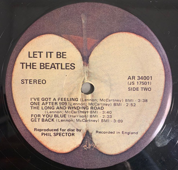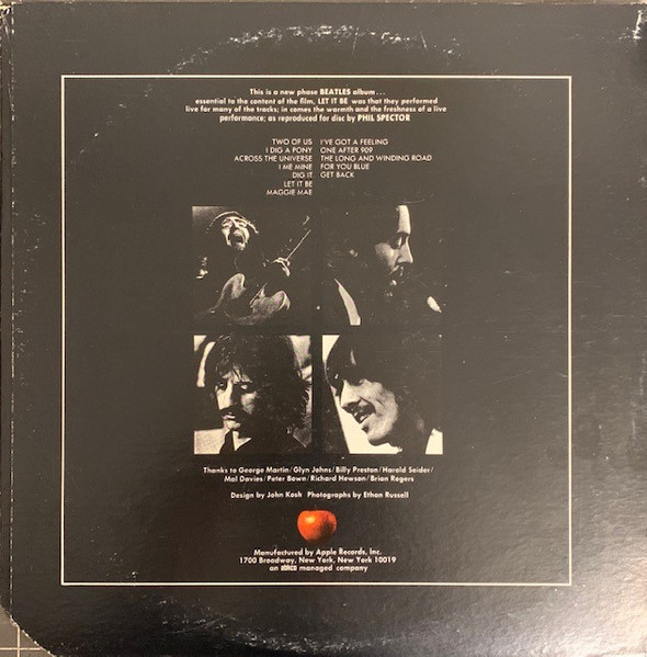 Released with a vinyl weight of 190 (measured) grams, with a red apple on Side One of the center record label. With the exception of the strike out matrices etched within the dead wax of Side One, and correct printing along the spine, this would be the identical version of: The Beatles - Let It Be.