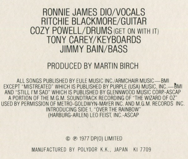 All songs published by Eule Music Inc./Armchair Music-BMI, except "Mistreated", which is published by Purple (USA) Music, Inc.-BMI and "Still I'm Sad", which is published by Glennwood Music Corp.-Ascap. A portion of the M.G.M. Soundtrack Recording of "The Wizard Of Oz" used by permission of Metro-Goldwyn-Mayer Inc. and M.G.M. Records Inc. introducing side 1, "Over The Rainbow" (Harburg-Arlen) Leo Feist, Inc.-ASCAP.