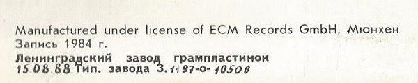 Manufactured under license of ECM Records GmbH, Мюнхен