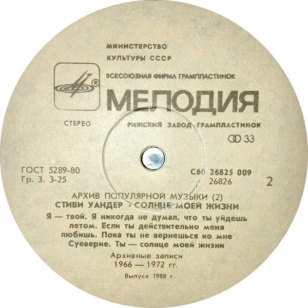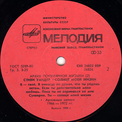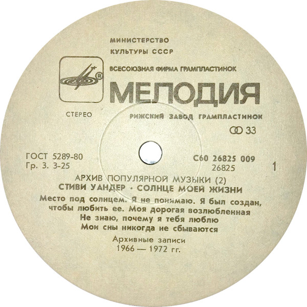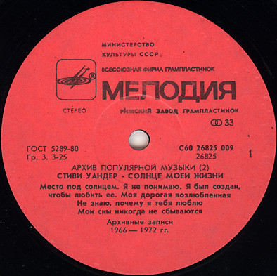 Stevie Wonder songs from 1966 to 1972, with a biography (in Russian) printed on the back side. Tracklisting is given in both Russian/English.