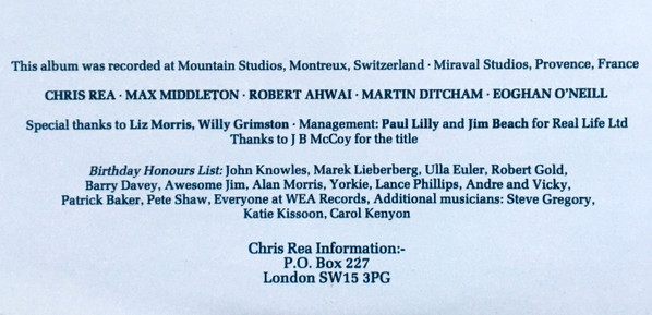 - Musician [no role given] – Chris Rea, Eoghan O'Neill, Martin Ditcham, Max Middleton, Robert Ahwai